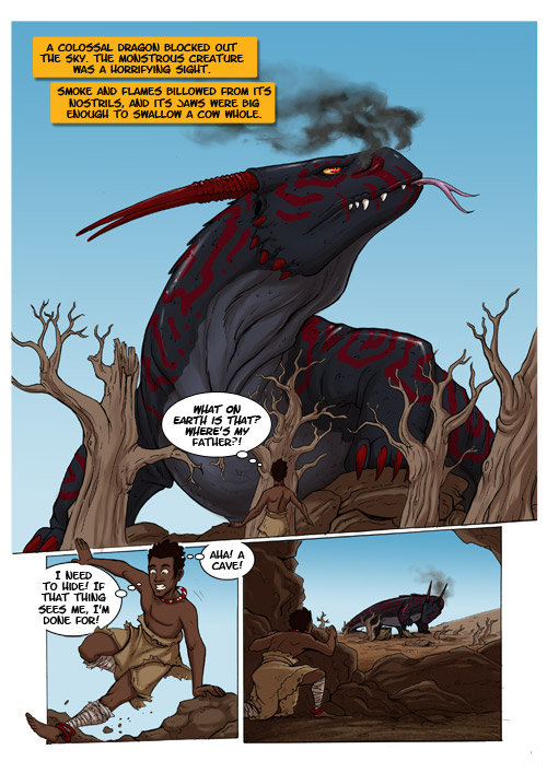 So this other big project, the one that actually ate up our Cottonstar time, is finally complete (minus the final edits after the comic has been shown to target groups) – and we are super chuffed with how it turned out. It was a huge amount of work, but we learnt A LOT, and we are pretty pleased with the level of work we produced. And the client was really nice too, which always helps motivate you to big projects such as this. Seeing as the client had already shared some of the pages here, We thought it would be cool for us to show you a bigger version of one of those pages they have on the site. Here is page 4 of Kweku Tsin and the Black Dragon, a comic book adaptation of a Ghanaian folk tale about how the sun, moon and stars were created. The target audience is pre-teens to young teens, and possibly some reluctant older teens as well.