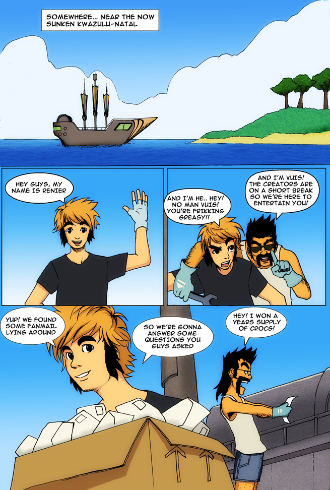 You thought we were out of  fan mail… but you were WRONG! This week our friend Clarence did a three page guest comic for us. Oddly enough he came up with this script while we were planning our Ask The Cast feature, and neither of us knew what the other was up to until it was practically done. So continuing along the meta theme, here is Clarence’s comic. This will be the last piece of filler content until we start Chapter 4 next week! 🙂