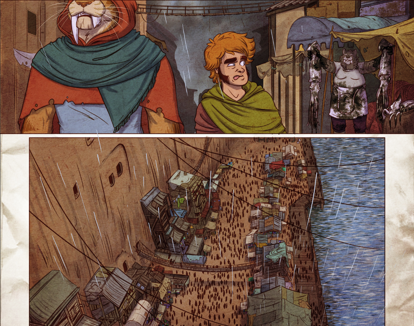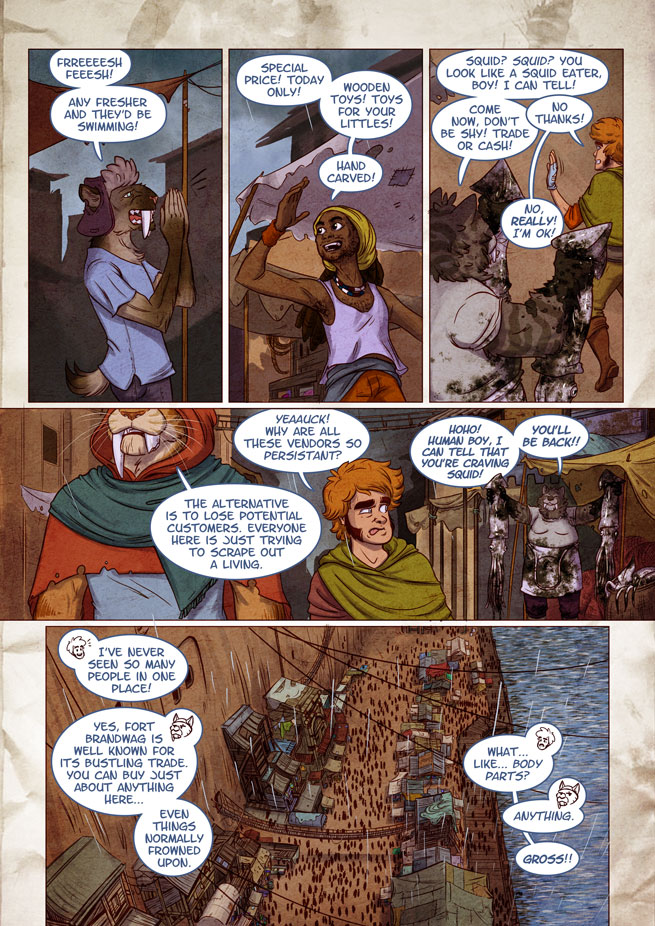 The last panel with the market scene took us forever to do. +_+ On top of that, we spent our entire weekend last week doing a really fun project at the Book Lounge! We painted a huge window mural with our friend Deon de Lange in anticipation of Open Book Comics Fest which will be happening again in September! I’ll put some pictures in the next blog post. They are on our Facebook page too, if you can’t wait that long.