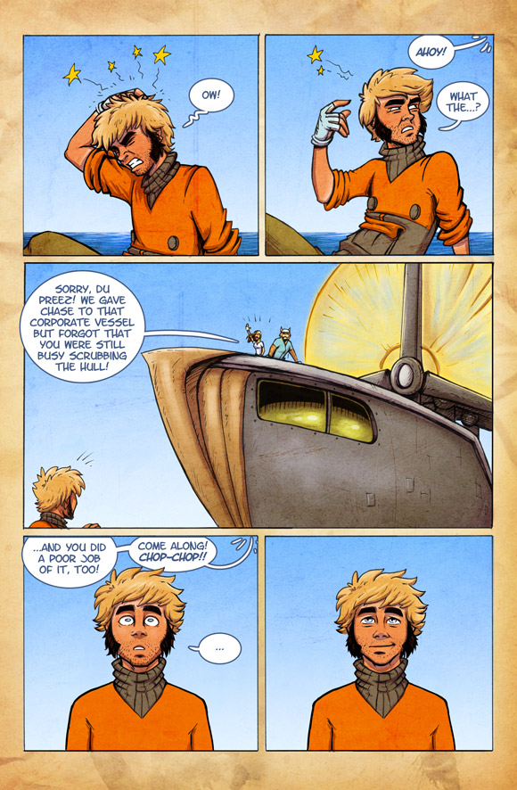 I have never seen him smile like that…..it is a….real smile…a true one…impressive. Time to take a photo to remember it, when he scrubs the deck, deals with Vuis, argues with Noah about his mania for cleaning, avoiding Rekas public display of affection or simply trying to ignore the Dominos “kindness”. But for the moment he seems to be happy about his friends coming for the rescue ^^