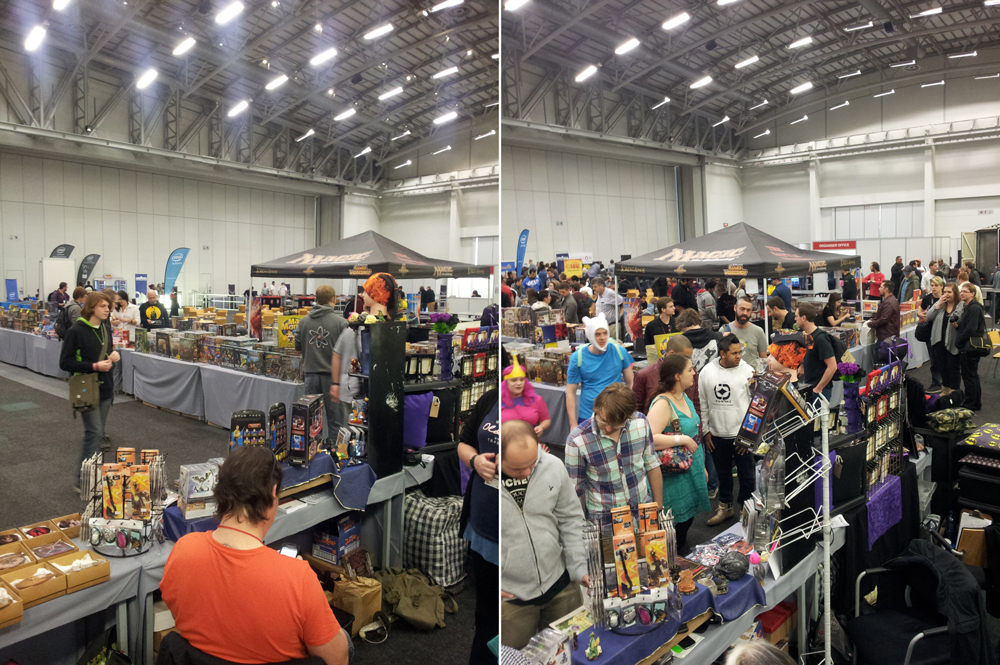 The crowd on Friday at opening, vs. on Saturday at opening.