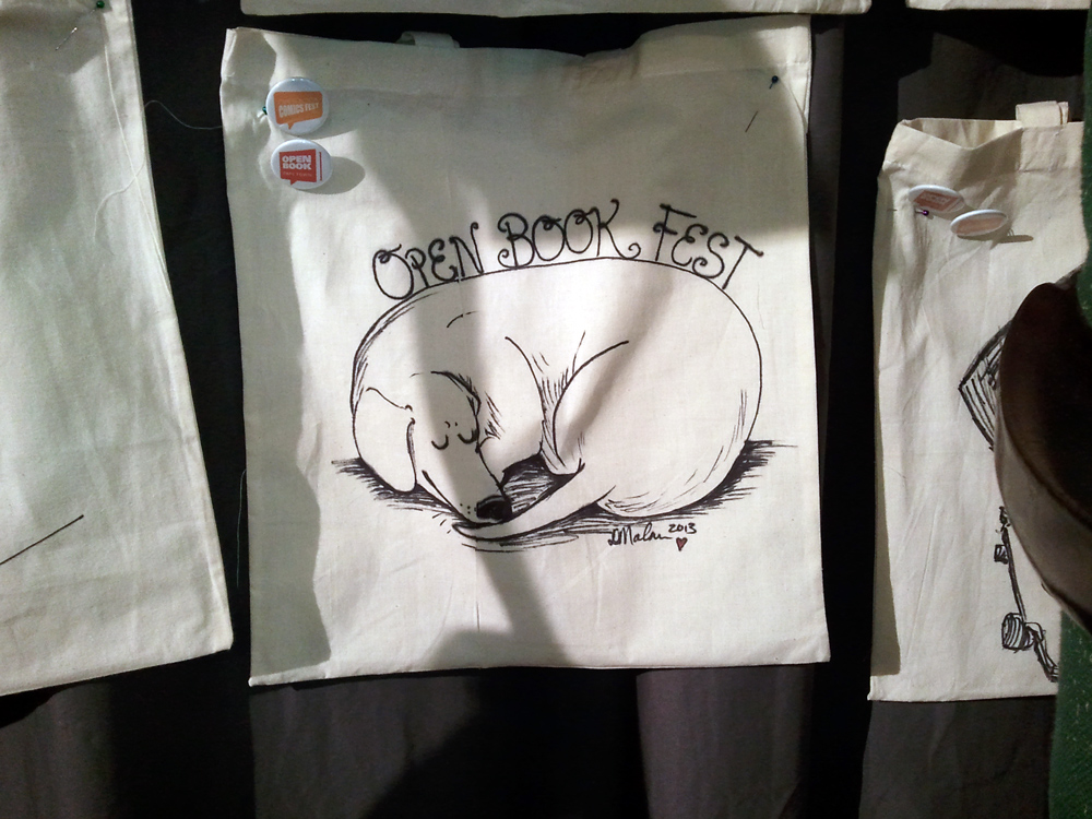 Another fun part of the event was that we got to do some work for charity. There were lots of blank tote bags that were given to artists to draw on. We were provided with some markers and things, and we could draw whatever we liked. In Danelle’s case, it was butts and dachshunds. In Ben’s, it was Noah. These bags were then put on display and sold for R80, with all the proceeds going towards a fund to build a library in an underprivileged area (I think it’s Kayalitsha, unless I heard incorrectly?). All of Danelle’s bags sold on the day, but Ben still has a Noah bag which is on display at the Book Lounge. Last we heard it was still available for purchase, so go and grab it if you’re keen. 🙂