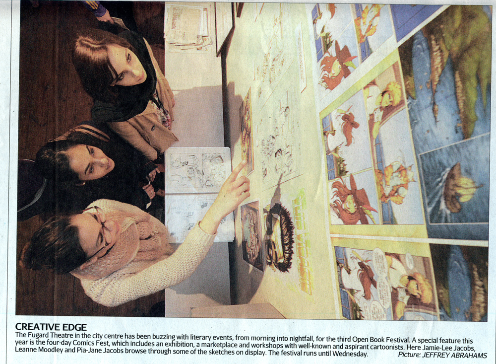 There is also an exhibition on the process of making comics, curated by the CCIBA. Our work is on there too, along with Mr. Vuis Visagie by Heineche Smith, and it even got a little feature in a local newspaper! See photos below: